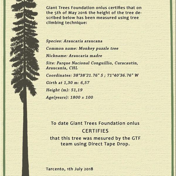 Particolarità: lo abbiamo scalato solo fino al primo palco a 20,07 metri. Poi è stato misurato scalando un vicino Nothofagus per rispettare la sua sacralità e l'enorme quantità di licheni presenti