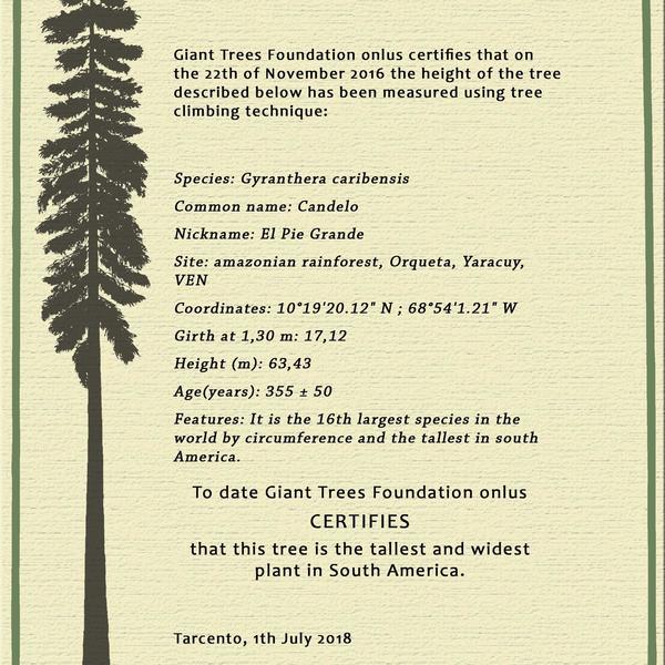 Particolarità: circonferenza alla base 29,73 m - altezza del primo ramo 29,50 m - ampiezza chioma 48 m; per ora è l'albero più alto misurato in tree-climbing del Sud America
