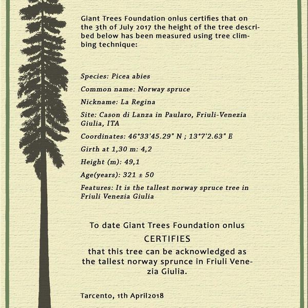 Particolarità: chiamato "la Regina" è l'abete rosso più alto del Friuli Venezia Giulia