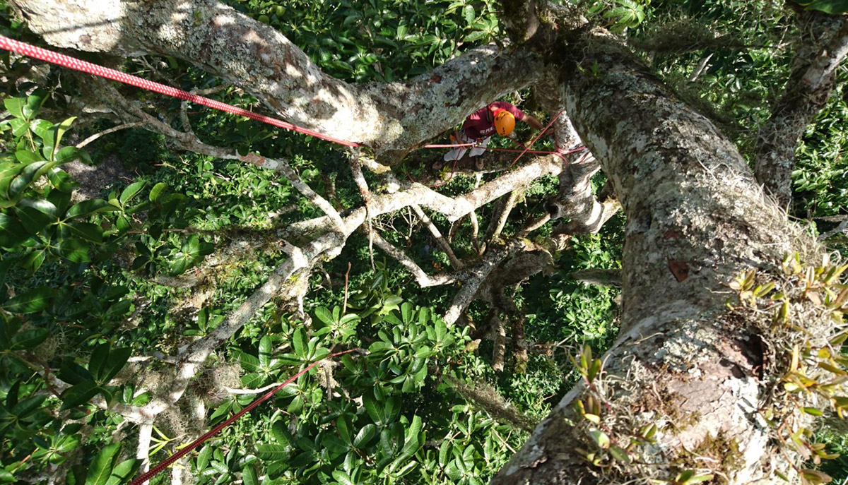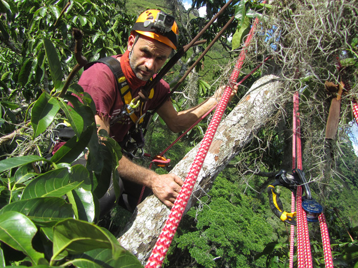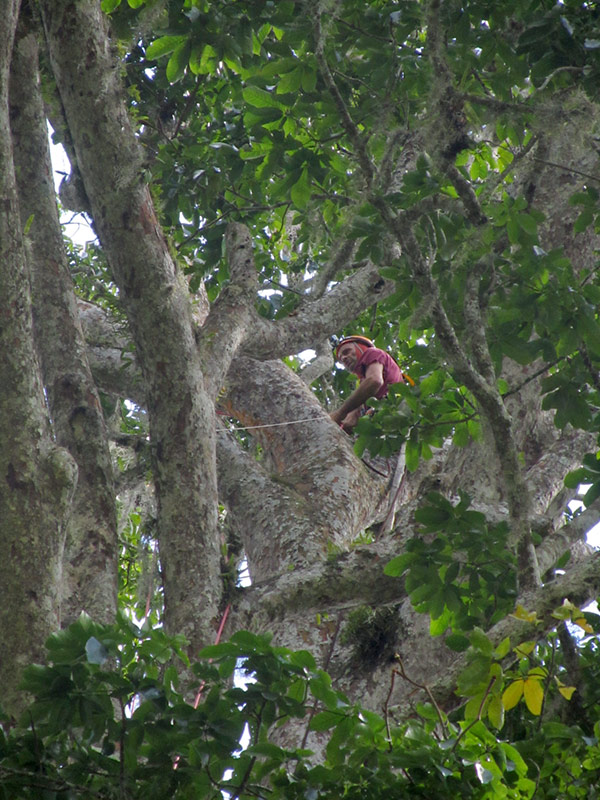 L’impresa di misurarlo non è comunque stata semplice. Il primo ramo era a 35 metri di altezza e il nostro fiondone per lanciare il sagolino, dopo molti tentativi si era rotto. Con una riparazione di fortuna e un lancio ancor più fortunoso siamo riusciti a raggiungere il primo ramo ma un enorme nido di quasi due metri di diametro di pegones (imenotteri appartenenti al genere Melipona) ci sbarrava la strada.